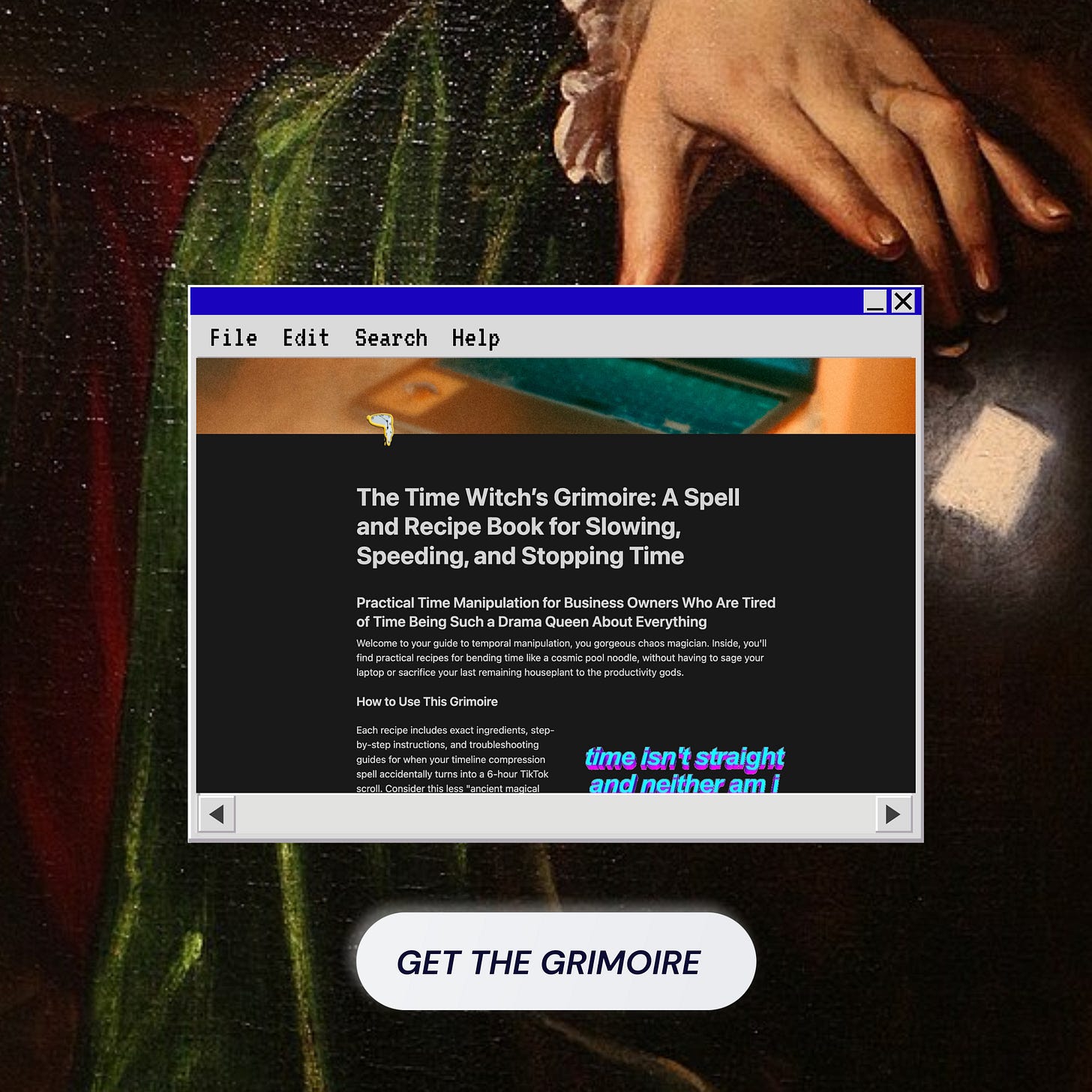 Want the complete guide to temporal manipulation, including my exact protocols for bending time like a cosmic pool noodle? Download The Time Witch's Recipe Book — a practical grimoire for entrepreneurs who are tired of time being such a drama queen about everything.